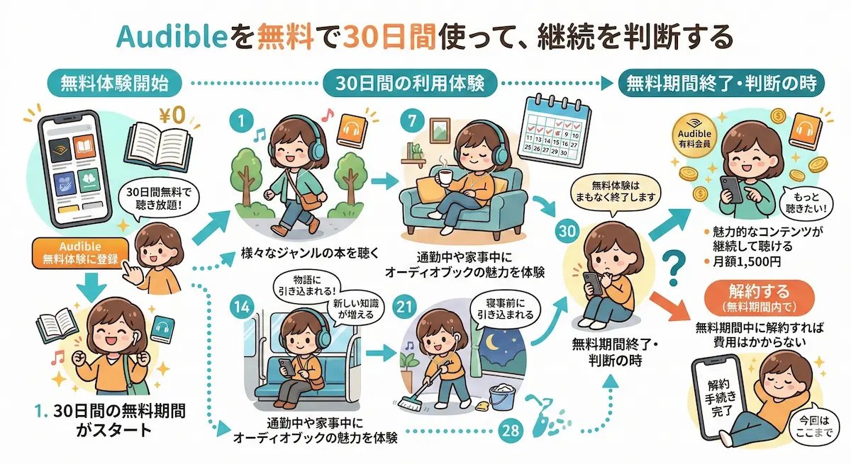 「Audibleの無料体験、本当に自分に合うのかな」「30日間使ってみたけど、続けるべきか解約すべきか迷っている」